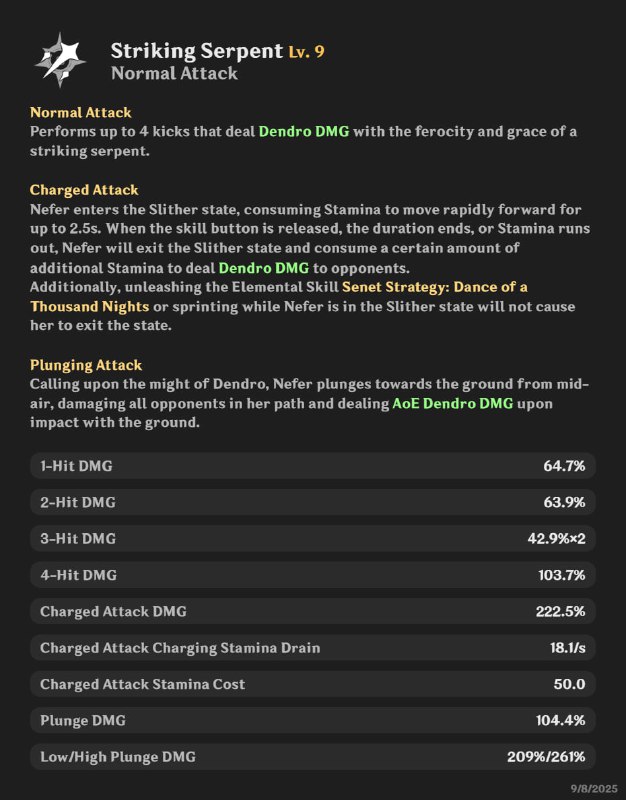 进入蛇行状态,以消耗体力为代价,进行至多2.5秒的高速移动。松开技能、持续时间结束或体力耗尽时,奈芙尔将退出蛇行状态,并额外消耗一定体力,对敌人造成草元素伤害。 此外,奈芙尔处于蛇行状态下时,施放元素战技弈术·千夜一舞或进行冲刺不会使奈芙尔退出蛇行状态。